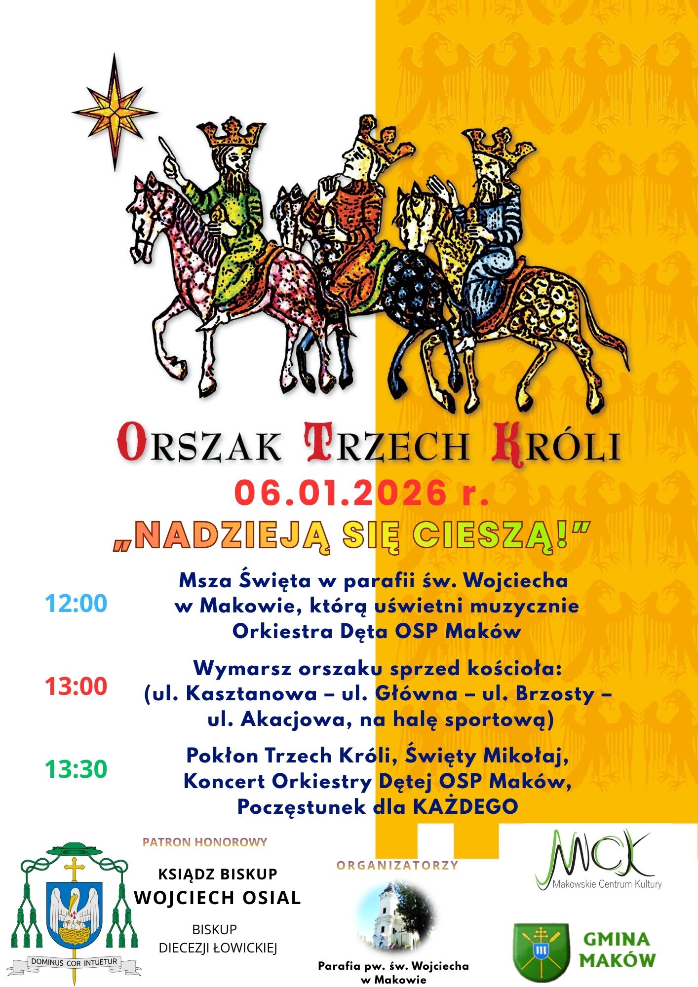 6 stycznia - po raz pierwszy odbędzie się w Makowie Orszak Trzech Króli. Program będzie następujący: O godz 12.00 – Msza święta w oprawie muzycznej orkiestry dętej OSP w Makowie, po której wyruszymy w orszaku do hali sportowej. Tam odbędzie się pokłon Trzech Króli, a następnie koncert w wykonaniu Orkiestry. Organizatorem głównym wydarzenia jest Parafia św. Wojciecha w Makowie, a współorganizatorami są: Gmina Maków oraz Makowskie Centrum Kultury. Serdecznie zapraszamy dzieci do przebrania się za królów, pasterzy, owieczki, baranki i inne postacie związane z Bożym Narodzeniem. Trzy najciekawsze przebrania zostaną nagrodzone. Po koncercie odbędzie się poczęstunek dla wszystkich. Dodatkowo swoją obecnością zaszczyci nas św. Mikołaj, który dla dzieci przygotował podarki. Zapraszamy wszystkich do wspólnego, radosnego zakończenia Roku Jubileuszowego. Przez udział w orszaku włączamy się w wielką akcję ewangelizacyjną, ponieważ orszaki odbywają się w kilkuset miejscowościach w całej Polsce. Tegoroczne orszaki wyruszą pod hasłem „NADZIEJĄ SIĘ CIESZĄ!” Dzieci chętne do śpiewania podczas koncertu zapraszamy na próbę w piątek 2 stycznia o godz 18.00 w szkole w sali prób orkiestry.
